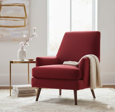 Check out how a cherry red armchair instantly elevates this neutral space: