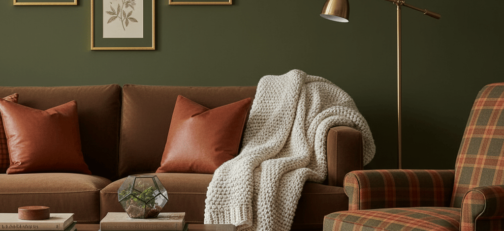 Imagine sinking into a sofa upholstered in a rich, deep brown velvet or a textured moss green. Layer in terracotta-hued throw pillows and a chunky knit blanket in a creamy latte shade. Add an accent chair in a sophisticated plaid that incorporates burnt orange and olive. Don't forget ambient lighting with brass or matte black lamps to enhance that moody glow!