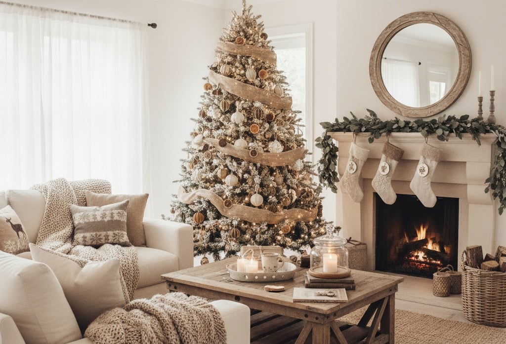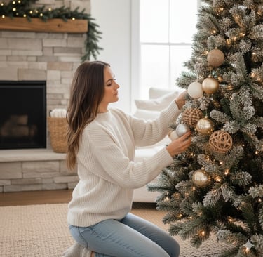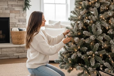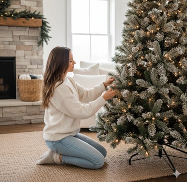 Looking for the perfect neutral Christmas decor aesthetic? This step-by-step guide covers everything you need to know about choosing and styling a gorgeous artificial Christmas tree with a warm rustic and cozy vibe! Learn the secrets to fluffing your flocked Christmas tree, layering ribbon and picks, and using a warm color palette for a designer look. Stop scrolling and start decorating!