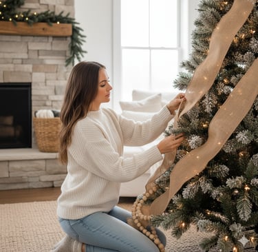 Ribbon: I love using wide, wired burlap or a rustic linen ribbon. Cut it into long strips and tuck it deep into the tree, letting it cascade down and around the branches. You can do a simple vertical drape or a more intricate "tucked and puffed" method. This adds so much warmth and visual interest.
