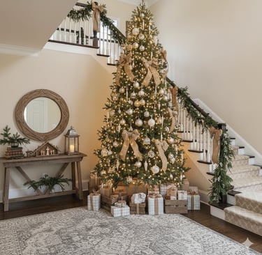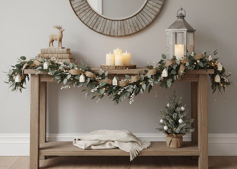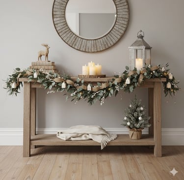 The entryway table we styled is the definition of a warm welcome. It blends the freshness of traditional Christmas greenery with the sophisticated, calming tones of rustic and neutral decor. No bright plastic, just natural textures, soft lights, and timeless charm.
