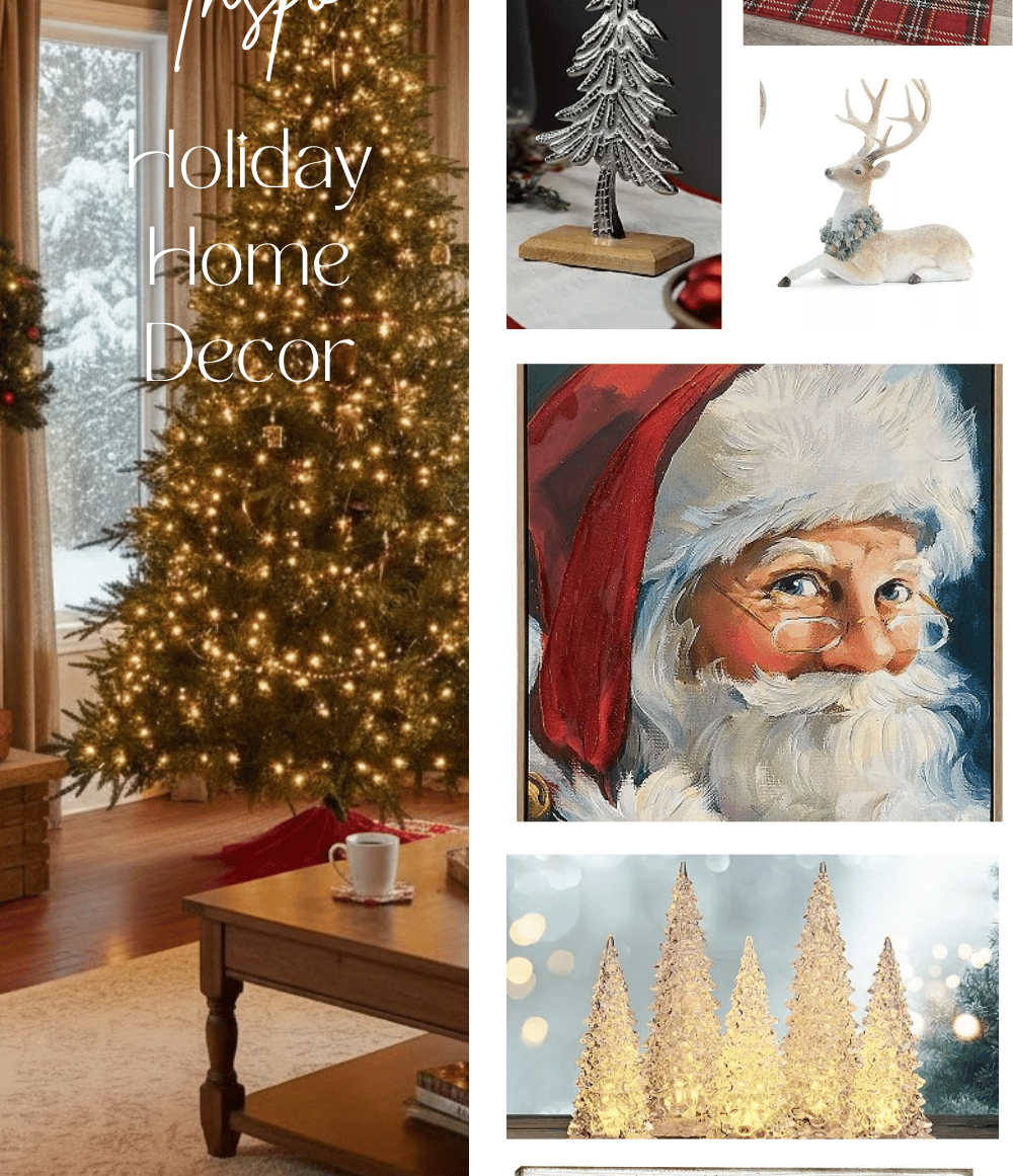 Get inspired to decorate your home this holiday season with cozy, classic, and traditional Christmas decor ideas! This pin features a beautifully lit, full Christmas tree with warm lights, rustic wood accents, and festive elements. Find inspiration for your Christmas mantel, living room, and entryway with items like plaid rugs, Santa Claus art, reindeer decor, and shimmering lighted glass trees. Perfect for those who love a farmhouse Christmas or traditional holiday home look. Use these ideas to create a warm and inviting atmosphere for your family gatherings.